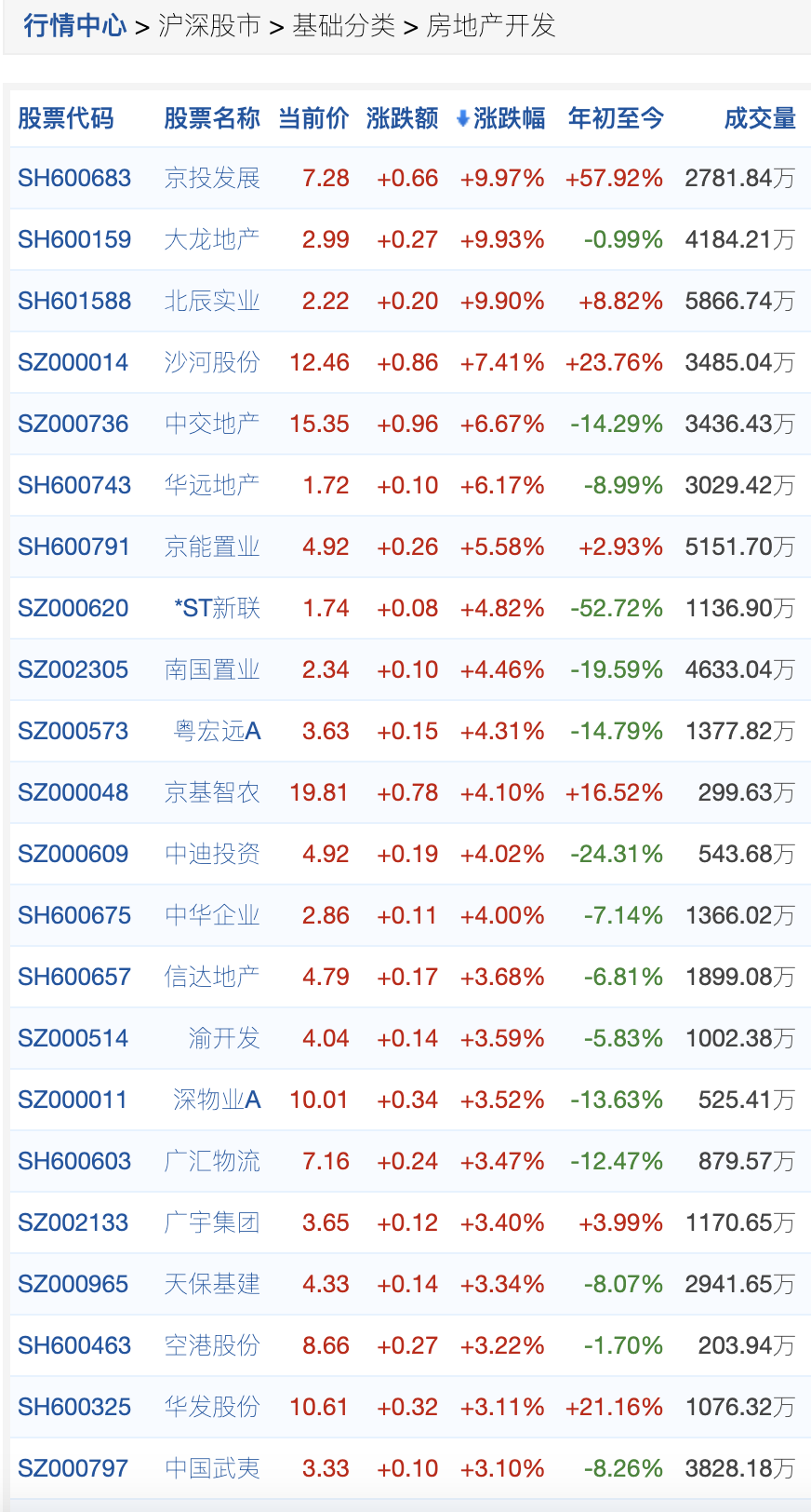 乐居财经 严明会 6月8日,A股房地产设立板块盘中拉升,轨则发稿,京投发展、大龙地产、北辰实业涨停;中交地产、华远地产、京能置业涨超5%,南国置业、信达地产、华发股份等纷繁跟涨。