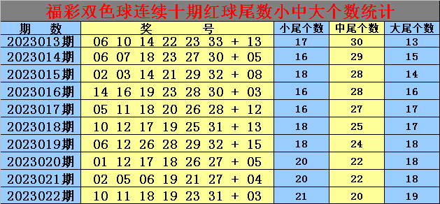 开奖转头:福彩双色球第2023022期奖号:10 11 18 19 23 31 + 03,其中红球开出3个小尾号:10 11 31,出现1个中尾号:23,出现2个大尾号:18 19。蓝球余数为中尾。