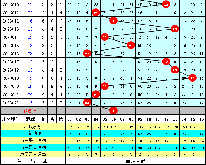 上期蓝球号码为03,为中尾蓝球,最近10期出现了1个小尾蓝球,8个中尾蓝球,1个大尾蓝球,中尾蓝球出现个数较多,上期开出,本期看好重迭出现,崇敬蓝球06。