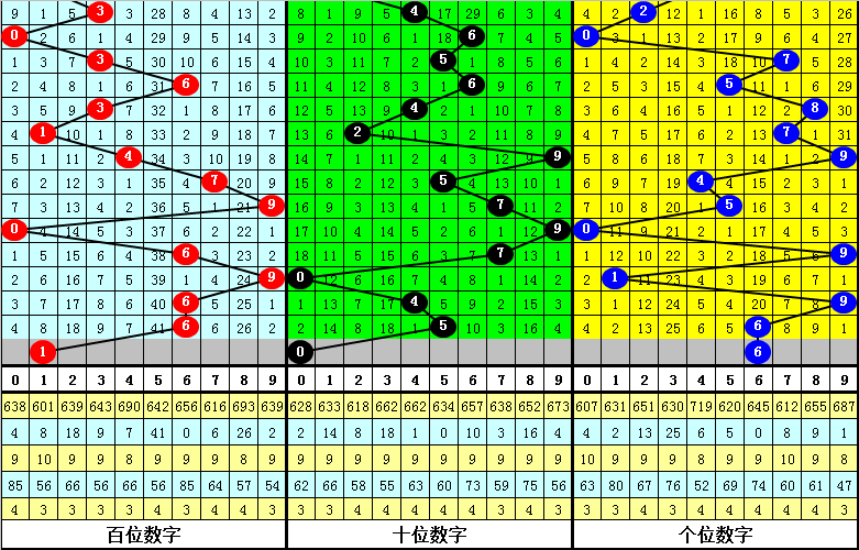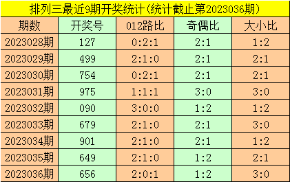 二、体彩枚举三前9期奖号开出:127-499-754-975-090-679-901-649-656,其中奖号大小比为18:9,012路比为14:9:4,奇偶比为16:11;
