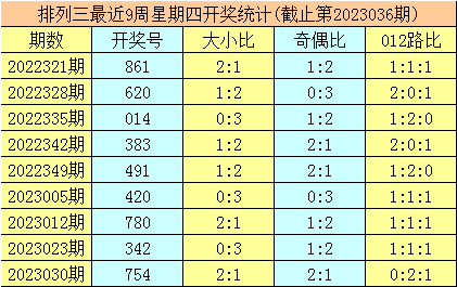 三、体彩枚举三前9周星期四奖号阔别开出:861-620-014-383-491-420-780-342-754,其中号码012路比为10:10:7,奇偶比为10:17,大小比为9:18;