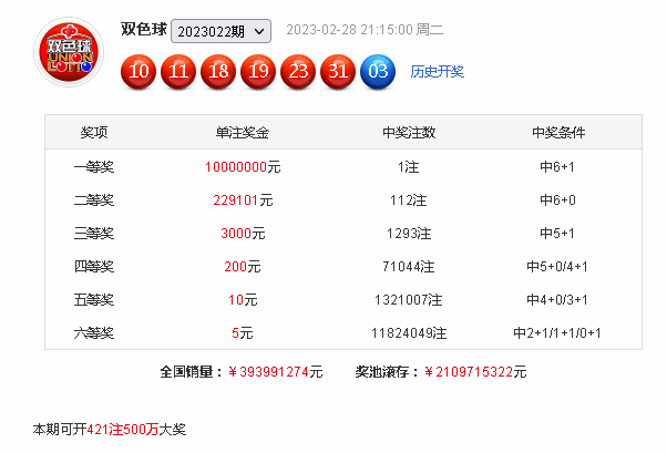 双色球第2023022期开出奖号为10、11、18、19、23、31+03。其中红球号码奇偶比为4:2,三区比为2:2:2,大小比为4:2,蓝球开特等数号码03。